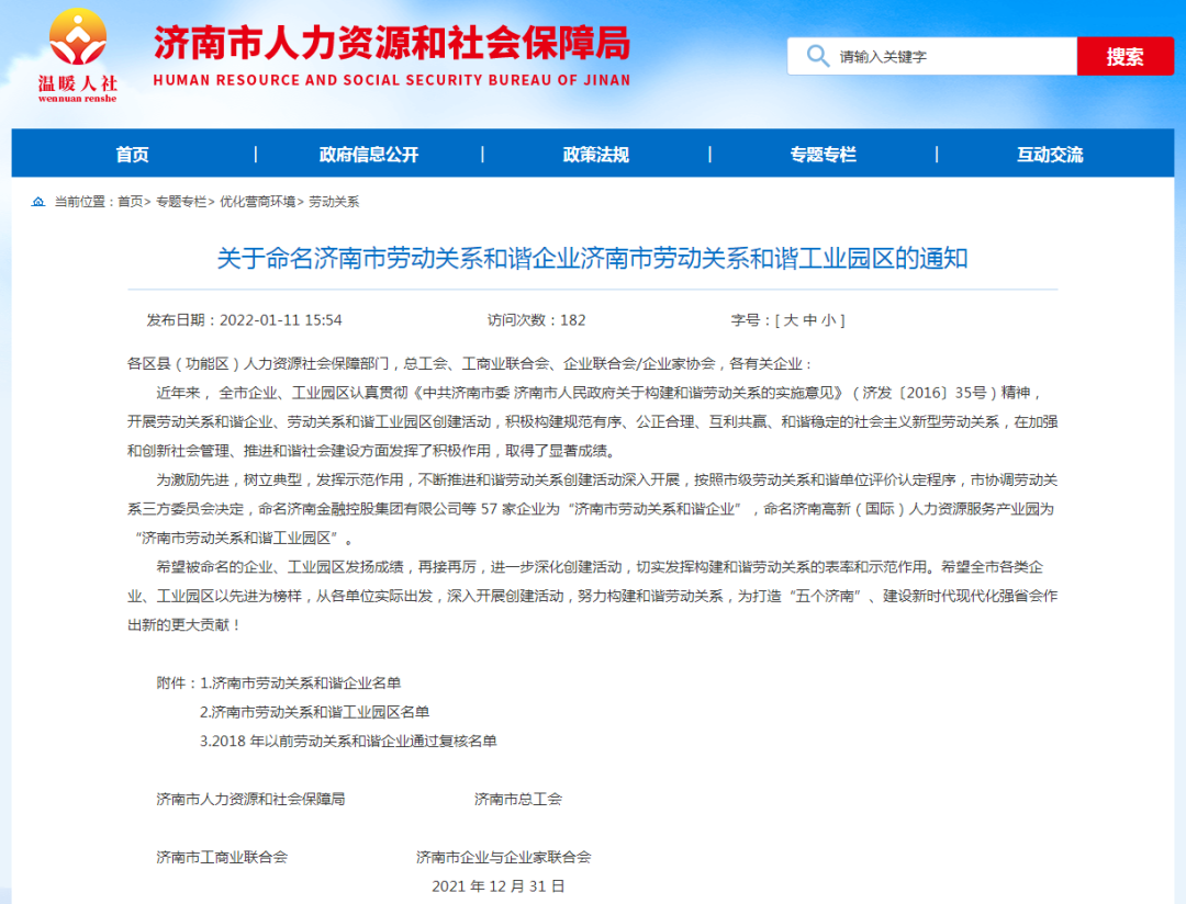 近日,济南市人力资源和社会保障局、济南市总工会、济南市工商业联合会、济南市企业与企业家联合会共同下发《关于命名济南市劳动关系和谐企业济南市劳动关系和谐工业园区的通知》,山东职来职往人力资源管理服务有限公司荣获“济南市劳动关系和谐企业”荣誉称号。